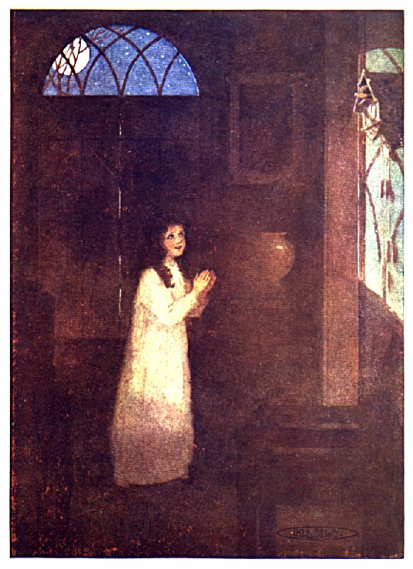 Up the shallow, wide, old-fashioned staircase, past the wainscoted walls, dark and shining like a mirror, down a long narrow[Pg 16] passage with many doors, which but for their gleaming brass handles one would not have known were there, the oldest of the three old servants led little Griselda, so tired and sleepy that her supper had been left almost untasted, to the room prepared for her. It was a queer room, for everything in the house was queer; but in the dancing light of the fire burning brightly in the tiled grate, it looked cheerful enough.