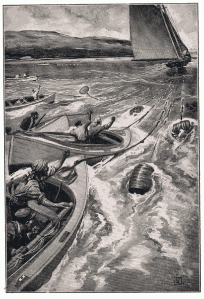 The whole fleet was now under way. In addition to the sails they had gotten out long sweeps, and the bay was being ploughed in every direction by the fleeing junks. I was now alone in the Reindeer, seeking feverishly to capture a third prize. The first junk I took after was a clean miss, for it trimmed its sheets and shot [18]away surprisingly into the wind. By fully half a point it outpointed the Reindeer, and I began to feel respect for the clumsy craft. Realizing the hopelessness of the pursuit, I filled away, threw out the main-sheet, and drove down before the wind upon the junks to leeward, where I had them at a disadvantage.