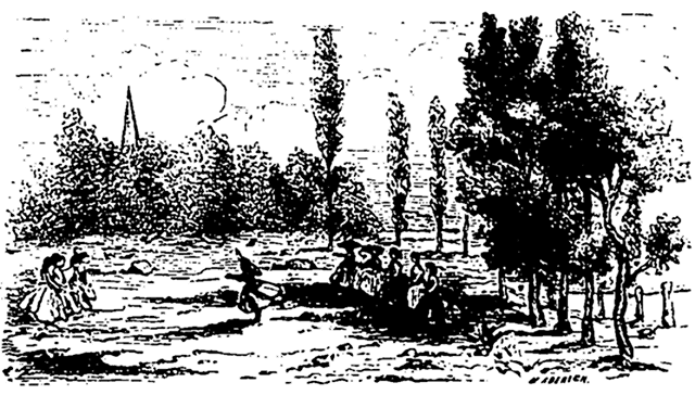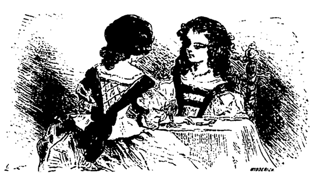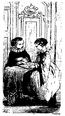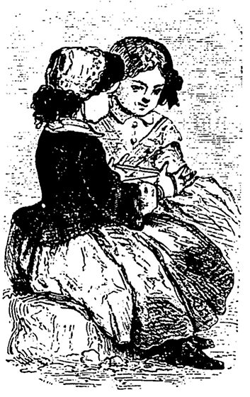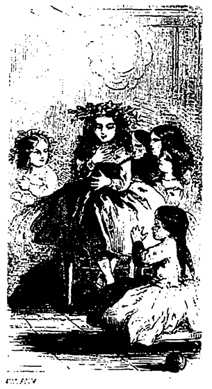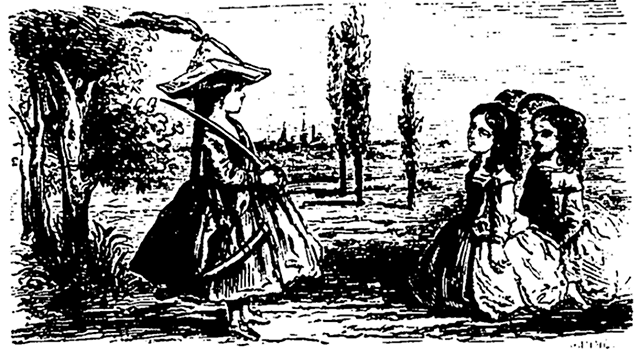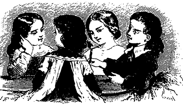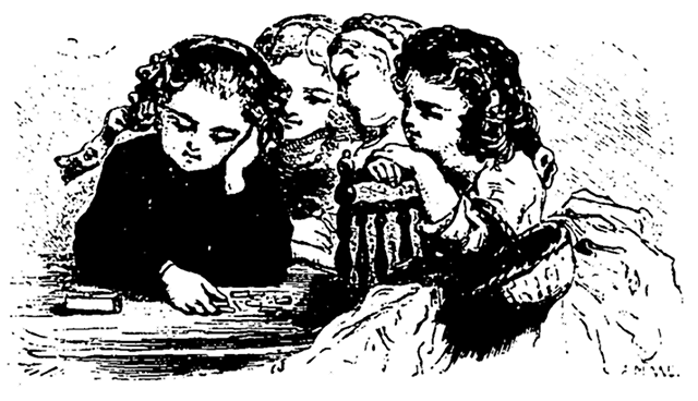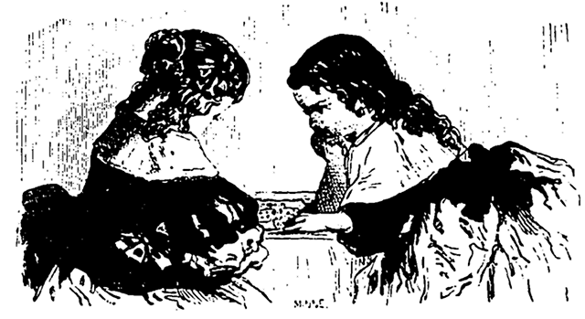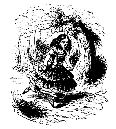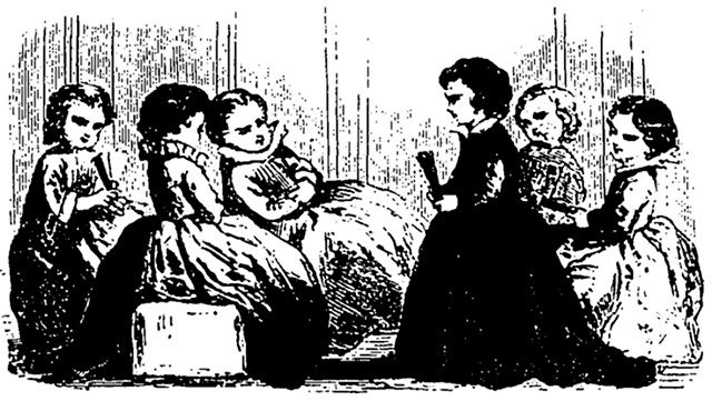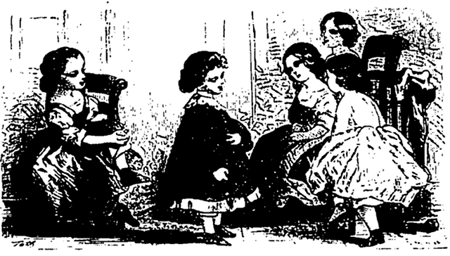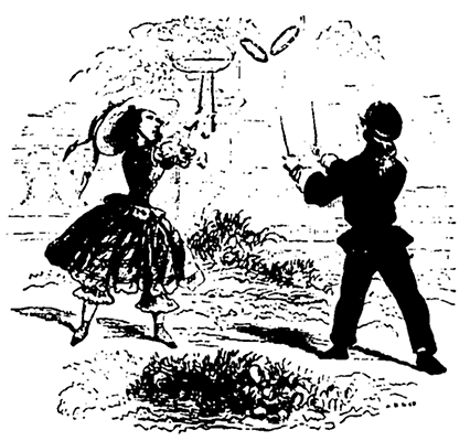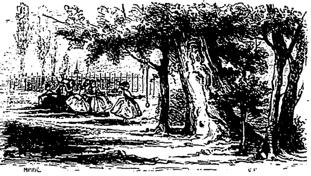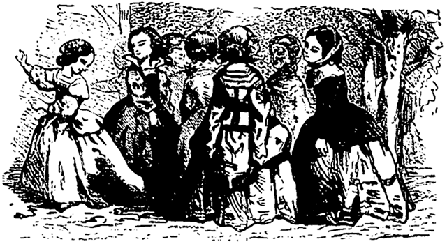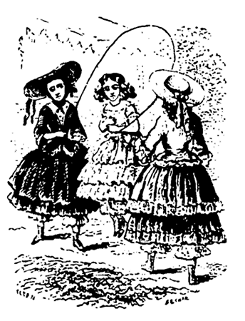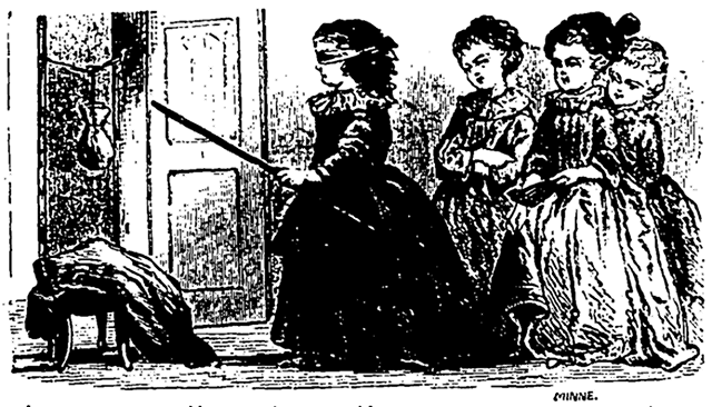 Pour nous justifier d'avoir présenté ici un jeu qui peut choquer les personnes délicates, nous rappellerons le souvenir d'une scène que nos jeunes lectrices liront peut-être un jour dans le charmant 18 roman de Goldsmith, le Vicaire de Wakefield; ce passage met complètement le jeu en action. Plusieurs jeunes filles sont réunies le soir d'un jour de fête chez un fermier du voisinage. Après avoir joué à plusieurs jeux, elles proposent celui de la savate. En conséquence, elles forment un rond en s'asseyant par terre, et en rassemblant la jupe de leurs robes un peu serrée contre elles. Puis on prend une pantoufle que l'on fait circuler sous l'arc que forment les genoux. Une certaine jeune miss, Olivia Primrose, est debout au milieu du cercle, essoufflée, rouge, agitée et criant, dit l'auteur, comme un chanteur de ballades. Au moment où le jeu est le plus animé, entrent, ô confusion! deux belles dames de Londres, dont on redoute beaucoup l'opinion, et les joueuses s'arrêtent interdites et consternées d'avoir été surprises dans ce vulgaire exercice.