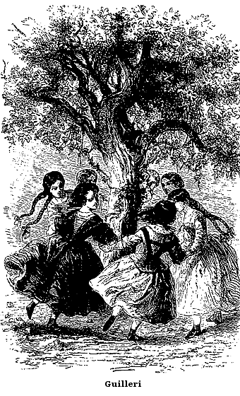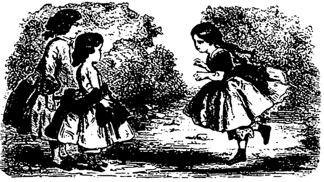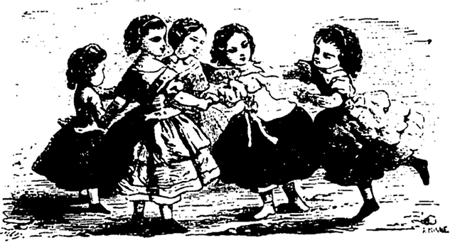 Note 3: (retour) Nous n'avons pas placé ce jeu parmi les rondes, parce qu'il n'est accompagné que d'une très-courte phrase de chant qui se rattache à l'action, mais sans la diriger, tandis que les rondes dont se compose la troisième partie de notre livre sont pour la plupart de petites scènes qui se jouent et se dansent à l'aide d'un chant presque continuel, qui en détermine les différentes parties.
