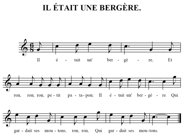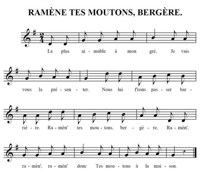 Plusieurs enfants, en se tenant par la robe, figurent un troupeau de moutons, ayant la bergère à 6 leur tête. Celle-ci chante, et les autres répètent après elle ces vers dont la rime n'est pas riche: