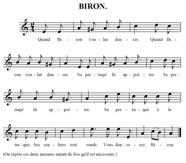L'été. Un cavalier et une dame vis-à-vis marchent en avant et en arrière, ou en avant-deux, pendant quatre mesures; puis de la même manière, 289 mais un peu en biais. Ils traversent ensuite pour changer de place, avancent et reculent un peu en biais deux fois, et retraversent pour gagner leur place. Quand ils s'en rapprochent, ils doivent faire une sorte de balancé avec le cavalier ou la dame qui les attendent; mais le balancé, autrefois très-marqué et suivi d'un tour de main, se fait à présent d'une manière presque inaperçue. Le cavalier et la dame qui n'ont pas dansé vont en avant-deux à leur tour. Les autres danseurs, placés sur les côtés, exécutent après eux la même figure.
