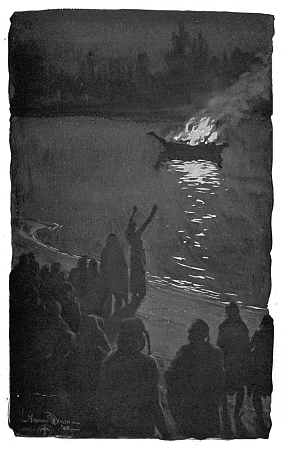 Then as night came on, and the smoky air darkened into deepest gloom, the canoe was taken out into the main current of the Columbia, and fire was set to the dry knots that made up the funeral pyre. In an instant the contents of the canoe were in a blaze, and it was set adrift in the current. Down the river it floated, lighting the night with leaping flames. On the shore, the assembled tribe watched it in silence, mute, dejected, as they saw their great chief borne from them forever. Promontory and dusky fir, gleaming water and level beach, were brought into startling relief against the background of night, as the burning vessel neared them; then sank into shadow as it passed onward. Overhead, the playing tongues of 266 fire reddened the smoke that hung dense over the water, and made it assume distorted and fantastic shapes, which moved and writhed in the wavering light, and to the Indians seemed spectres of the dead, hovering over the canoe, reaching out their arms to receive the soul of Multnomah.