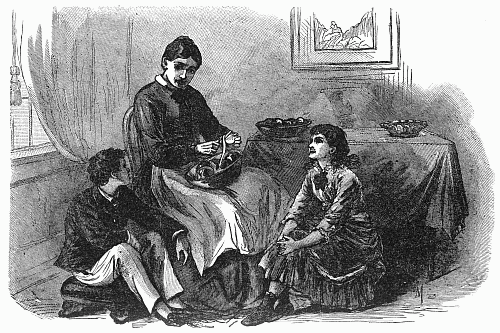 "Steady! St-e-a-dy!" cried Liddy, as after her hearty "help yourselves," the brother and sister made a simultaneous dash at the pan on her ample lap, playfully contesting for the largest. "One would think you were starving."