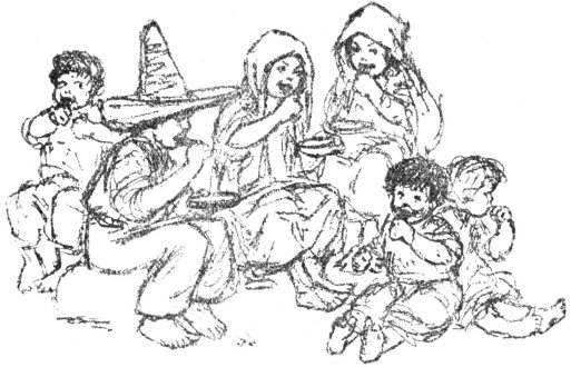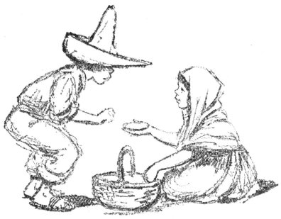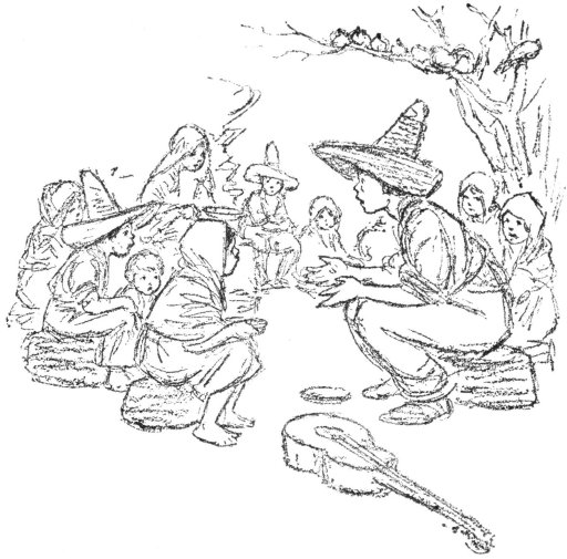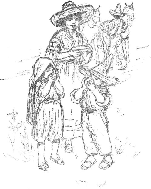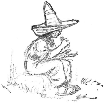 When they were warm, she brought some of them to Pancho, with a dish of beans and red chile sauce. Pancho sat down on a flat stone under the fig tree to eat his breakfast. He had no knife or fork or spoon, but he really did not need them, for he tore the tortillas into wedge-shaped pieces and scooped up the beans and chile sauce with them, and ate scoop, beans, chile sauce, and all in one [p 15] mouthful. The chile sauce was so hot with red pepper that you would have thought that Pancho must have had a tin throat in order to swallow it at all; but he was used to it, and never even winked his eyes when it went down. Just as he was taking the last bite of the last tortilla, Tonio came back, leading Pinto by the rope of his lasso.