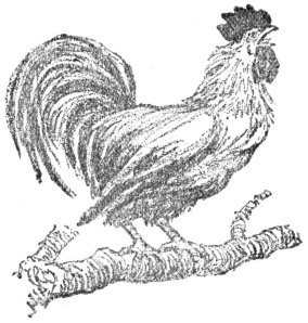 It was so very early that a few stars still shone, and a pale moon was sailing away toward the west. Over the eastern hills the rooster saw a pink cloud, and knew at once that it was time to wake the world. He stood up and stretched his wings. Then he crowed so long and loud that he nearly fell off his [p 6] perch backward, on to the cat, who was sleeping on the roof just below.
