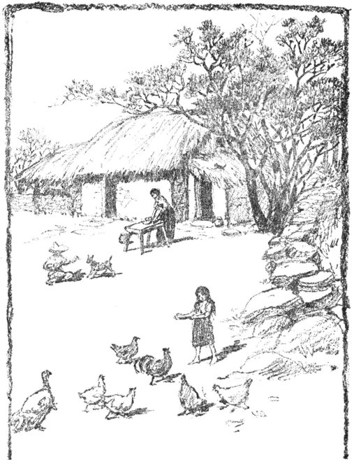 If you will turn the page you will find a picture of the little adobe hut where Tonio and Tita and Pancho and Doña Teresa live. Pancho isn’t in the picture, because he and Pinto are away in the fields, but Doña Teresa is there grinding her corn, and Tita is feeding the chickens, while Tonio plays with his dog, Jasmin6.