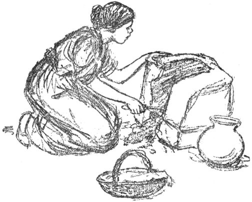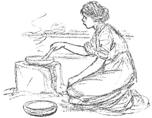 In the corner of the room there was a pretty basket covered with a white drawn-work napkin. Doña Teresa turned back the napkin and counted out ten flat cakes, made of corn meal. They were yesterday’s tortillas. These she put in the dish to heat.