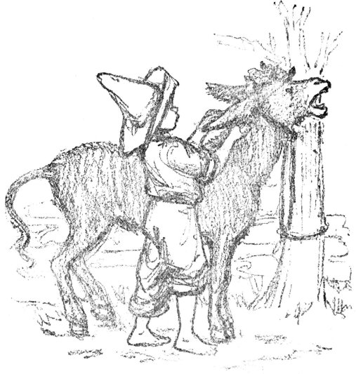 Tonio was very proud of catching Pinto and bringing him back to his father all by himself. He even put the saddle on. But the moment he felt the saddle-girth around him Pinto swelled up like everything, so that Tonio couldn’t buckle it! Tonio pulled and tugged until he was red in the face, but Pinto just stood still with his ears turned back, and stayed swelled.