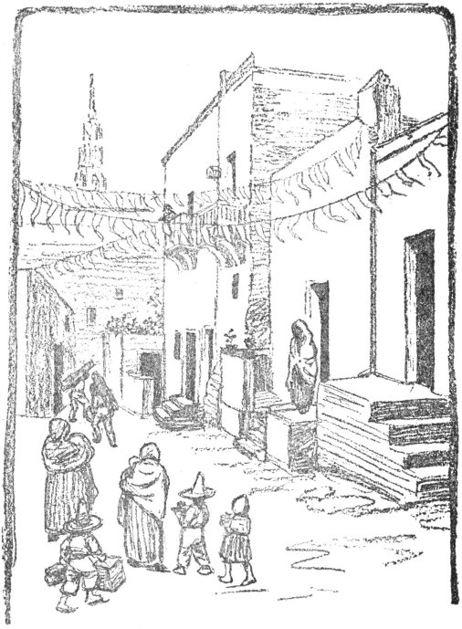 Then he lifted his hand and prayed, and [p 171] blessed the people, and the whole procession passed in front of the images, each one kneeling before them long enough to leave his lighted candle stuck in a little framework before the shrine. Señor Fernandez and his wife Carmen watched the scene from one end of the patio.