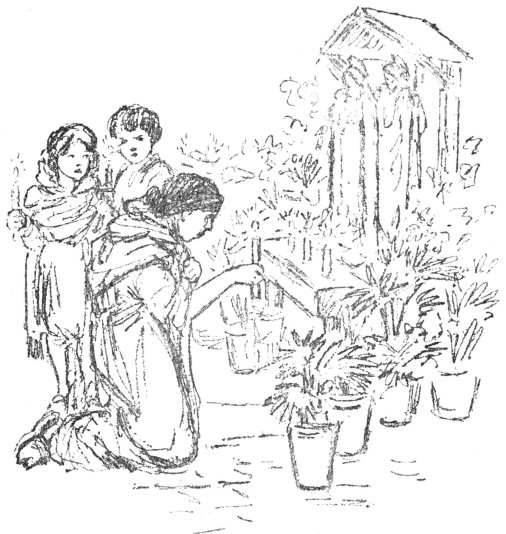 The priest led the procession through the entrance arch to the patio, and there he placed the images in a shrine, all banked with palms and flowering plants, which had been placed in the patio on purpose to receive them.