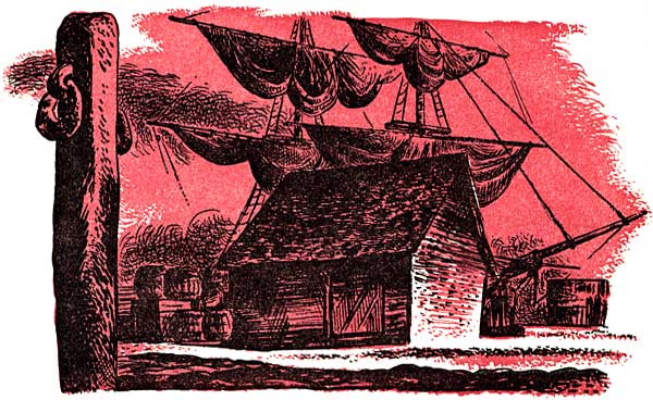 Across the water! Where was the freeway? It was no longer there, nor were the high walls and smokestacks of factories to be seen. The warehouses were still there. They were the very same, for Chris could make out the winch and tackle he had noticed as he opened the door. But instead of factories, instead of the freeway, the river flickered silver under the moon, and the hulls and masts of countless ships broke the starry sky.