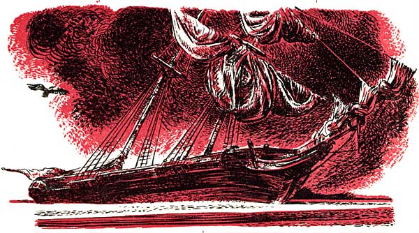 Chris returned to his own ship, and in his own shape at last, surveyed the dwindling island of mist that clung persistently[258] around the Vulture, blow though the wind might, and turn and turn again though the helmsman might try to do. How long, Chris wondered, would the mist hold? Or would the Vulture be doomed to drift at the mercy of the sea in its magic white shroud?