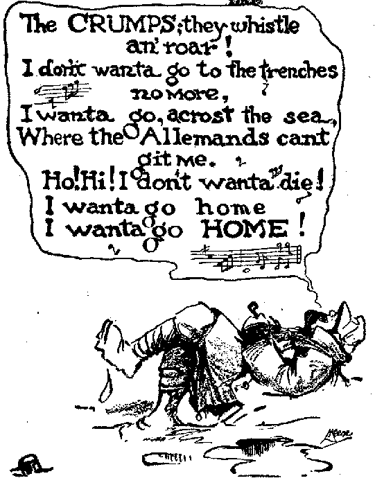 However, the Boche likes our beef. He prefers the brand canned in Chicago to his own, and will almost sit up and beg if we throw some over to him. The method is as follows: Throw one over ... sounds of shuffling and getting out of the way are heard in the enemy trench. Fritz thinks it's going to go off. Pause, and throw another. Fritz not so suspicious this time. Keep on throwing until happy voices from enemy trenches shout, “More! Give us more!” Then lob over as many hand grenades as you can pile into that part of the trench and tell them to share those too.