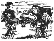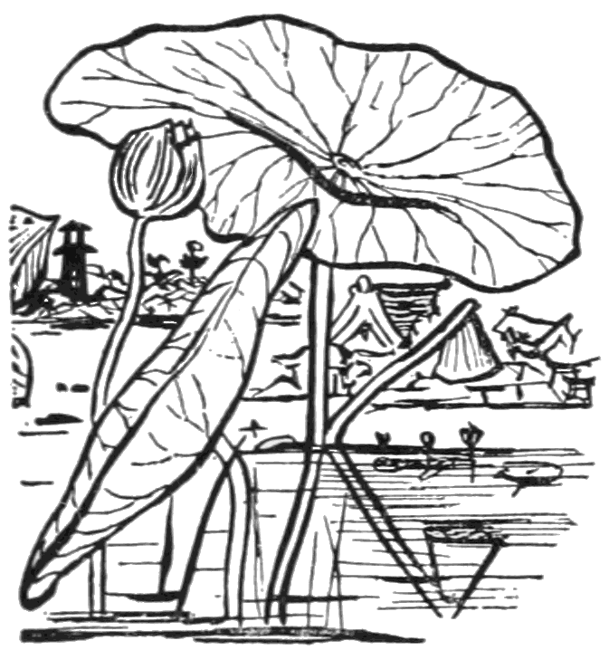 Yet all these things seem dull and lifeless when thus severed from the quaint cheeriness of their true home. To those familiar with Japan, that bamboo fan-handle recalls its graceful grassy tree, the thousand and one daily purposes for which bamboo wood serves. We see the open shop where squat the brown-faced artisans cleverly dividing into those slender divisions the fan-handle,[Pg xii] the wood-block engraver's where some dozen men sit patiently chipping at their cherry-wood blocks, and the printer's where the coloring arrangements seem so simple to those used to western machinery, but where the colors are so rich and true. We see the picture stuck on the fan frame with starch paste, and drying in the brilliant summer sunlight. The designs recall vividly the life around, whether that life be the stage, the home, insects, birds, or flowers. We think of halts at wayside inns, when bowing tea-house girls at once proffer these fans to hot and tired guests.
