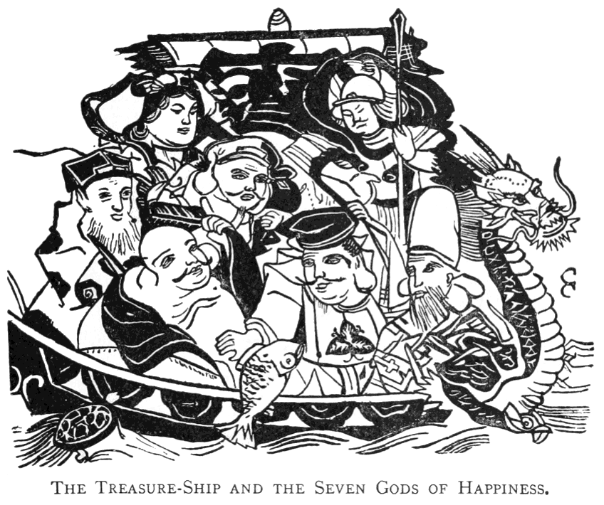 For the 2nd of January Plum-blossom bought[Pg 23] some pictures of the treasure-ship or ship of riches, in which were seated the seven Gods of Wealth.[10] It has been sung thus about this Ship of Luck:—