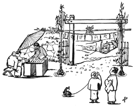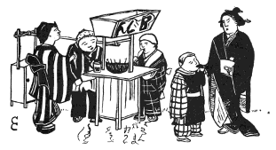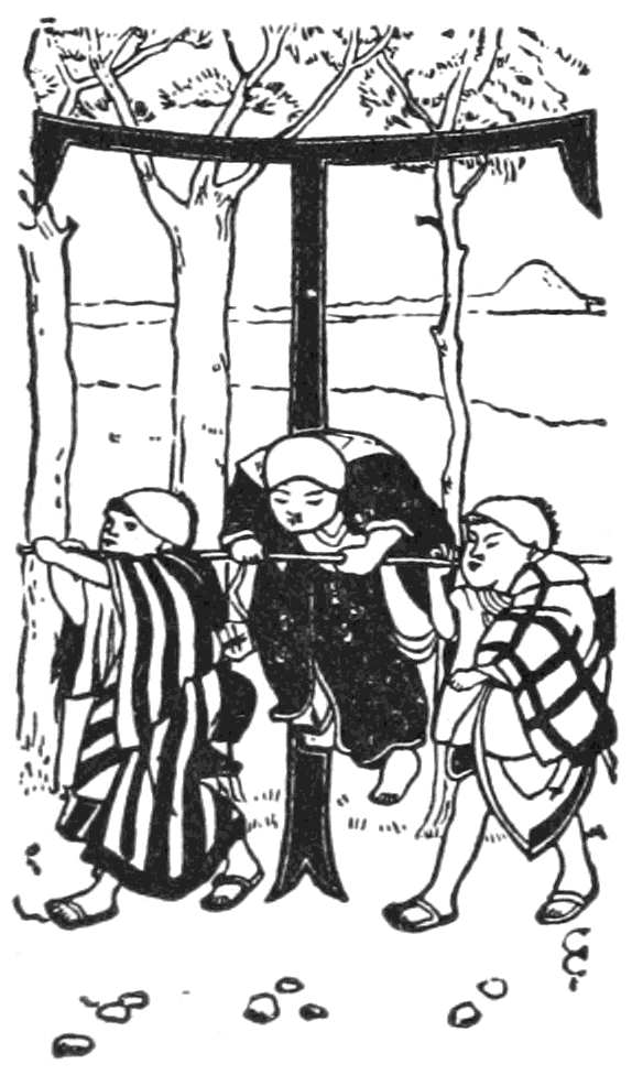 The tonsured oblique-eyed doll suggests the festival of similarly oblique-eyed little girls on the 3rd of March. Then dolls of every degree obtain for a day "Dolls' Rights." In every Japanese household all the dolls of the present and previous generations are, on that festival, set out to best advantage. Beside them are sweets, green-speckled rice cake, and daintily gilt and lacquered dolls' utensils. For some time previous, to meet the increased demand, the doll shopman has been very busy. He sits before a straw-holder into which he can readily stick, to dry, the wooden supports of the plaster dolls' heads he is painting, as he takes first one and then another to give artistic touches to their glowing cheeks or little tongue. That dolly that seems but "so odd" to[Pg xiii] Polly or Maggie is there the cherished darling of its little owner. It passes half its day tied on to her back, peeping companionably its head over her shoulder. At night it is lovingly sheltered under the green mosquito curtains, and provided with a toy wooden pillow.