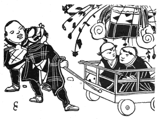 The mother told Plum-blossom and the children to get their clogs and overcoats and hoods, for she was going to get the New Year's decorations. The party shuffled off till they came to a stall where were big grass ropes and fringes and quaint grass boats filled with supposed bales of merchandise in straw coverings, a sun in red paper, and at bow and stern sprigs of fir. The whole was brightened by bits of gold leaf, lightly stuck on, that quivered here and there. When the children had chosen the harvest ship that seemed most besprinkled with gold, Plum-blossom bargained about the price. The mother, as a matter of form and rank, had pretended to take no interest in the purchase. She took her purse out of her sash, handed it to her servant, who opened it, paid the shopman, and then returned the purse to her mistress. This she did with the usual civility of first raising it to her forehead. The decorations they hung up in their sitting-room. Then they sent presents, such as large dried carp, tea, eggs, shoes, kerchiefs, fruits, sweets, or toys to various friends and dependants.[Pg 22]