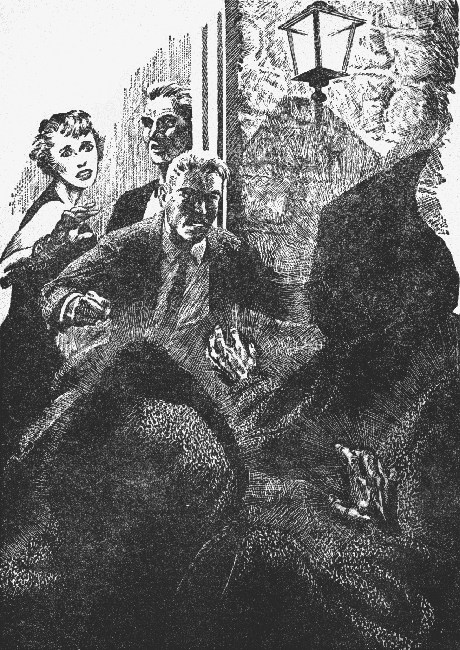 Lee went through the door with a leap, his fist driving at the cowled head of one of the figures—a solid shape that staggered backward from his blow. But the others were on him, dropping down before his rush, gripping his legs and ankles. He went down, fighting. And then something struck his face—something that was like a hand, or a paw with claws that scratched him. His head suddenly was reeling; his senses fading....