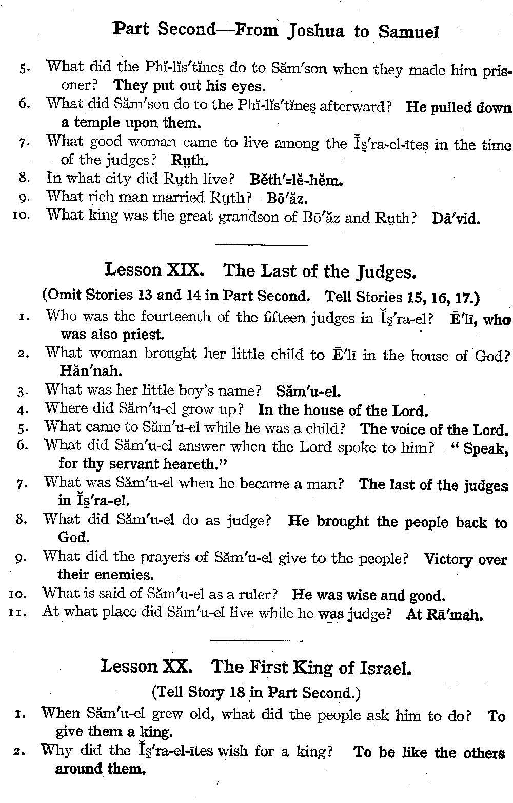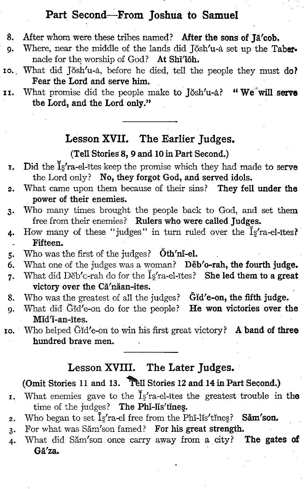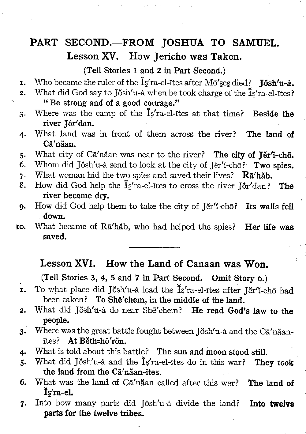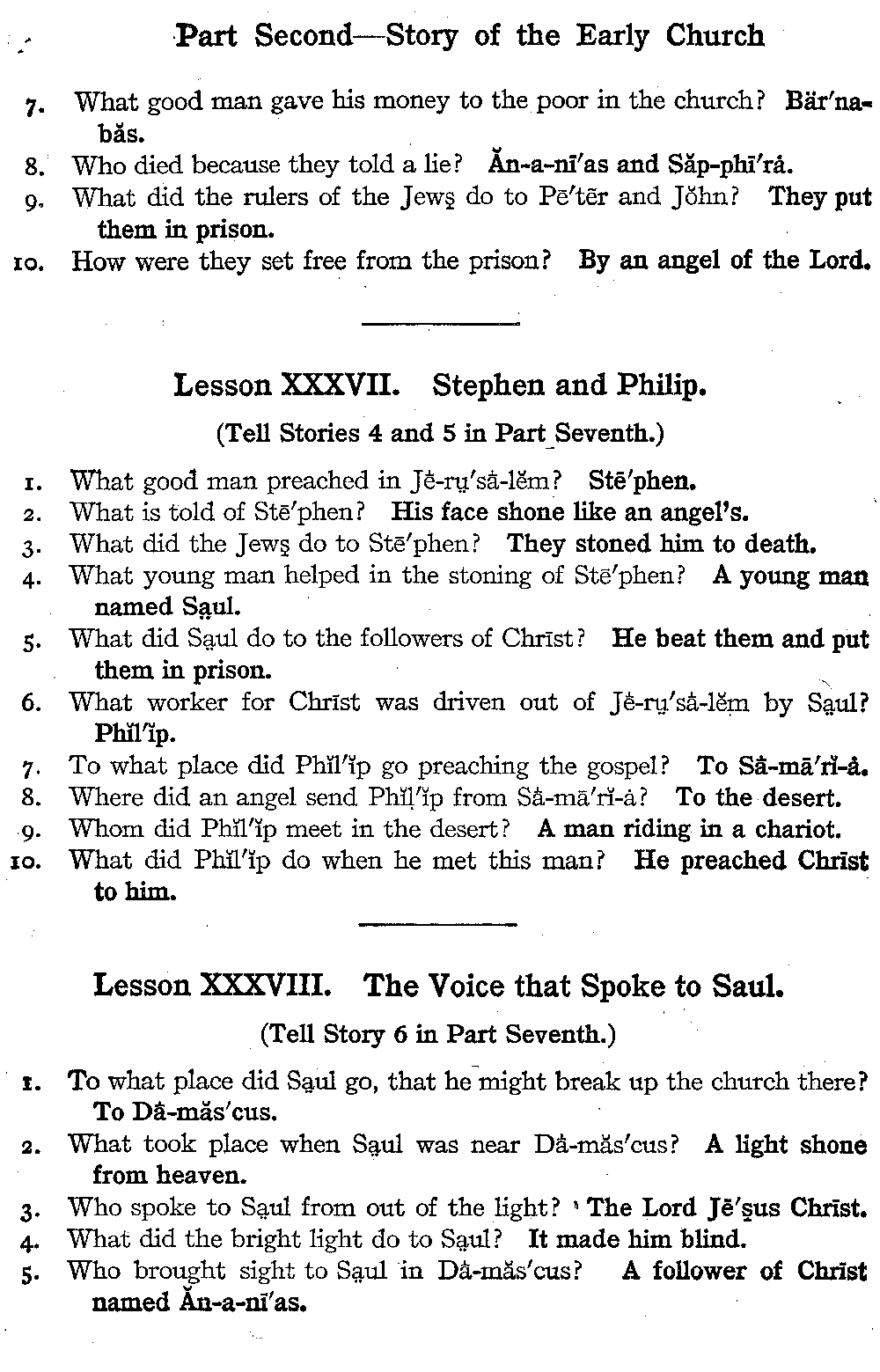 It will be seen that the questions and answers do not embrace all the stories in the book. A selection has been made of what seem to be the most important subjects, affording weekly lessons for one year, with allowance for vacations, in the Old Testament, and another year in the New Testament.