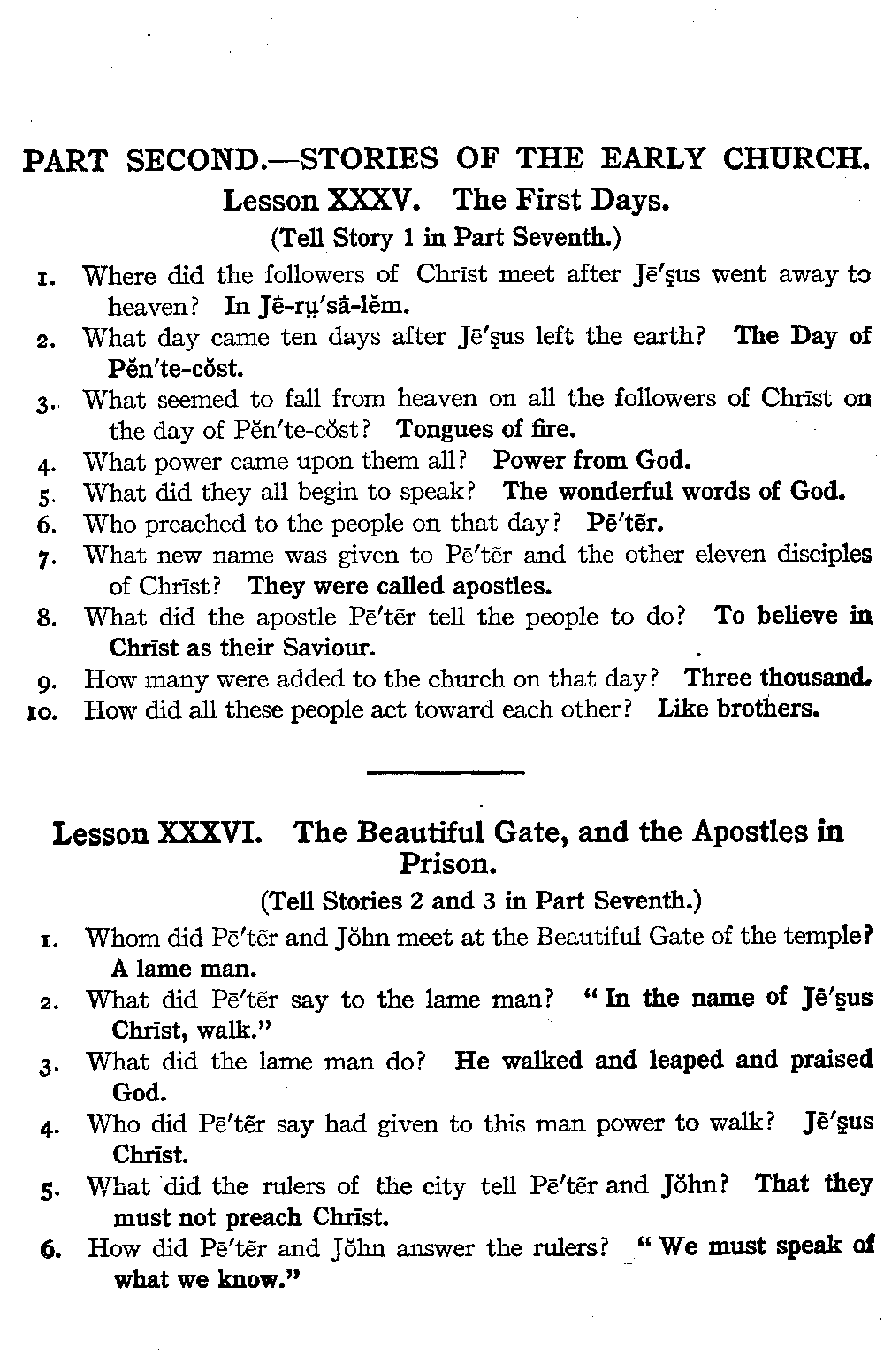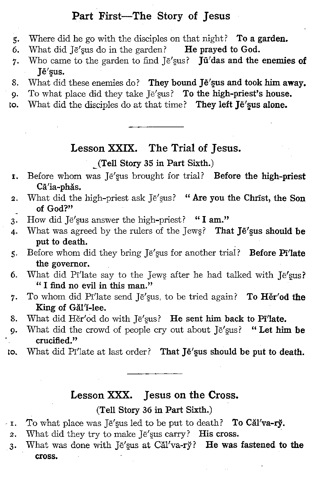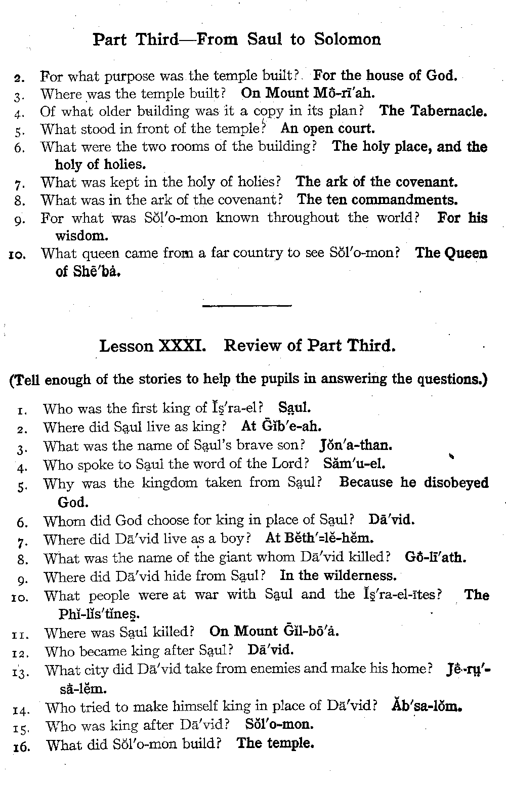 It will be seen that the questions and answers do not embrace all the stories in the book. A selection has been made of what seem to be the most important subjects, affording weekly lessons for one year, with allowance for vacations, in the Old Testament, and another year in the New Testament.