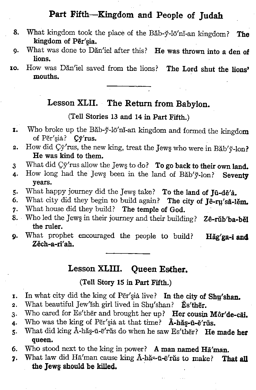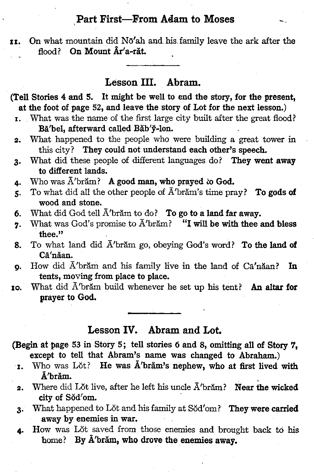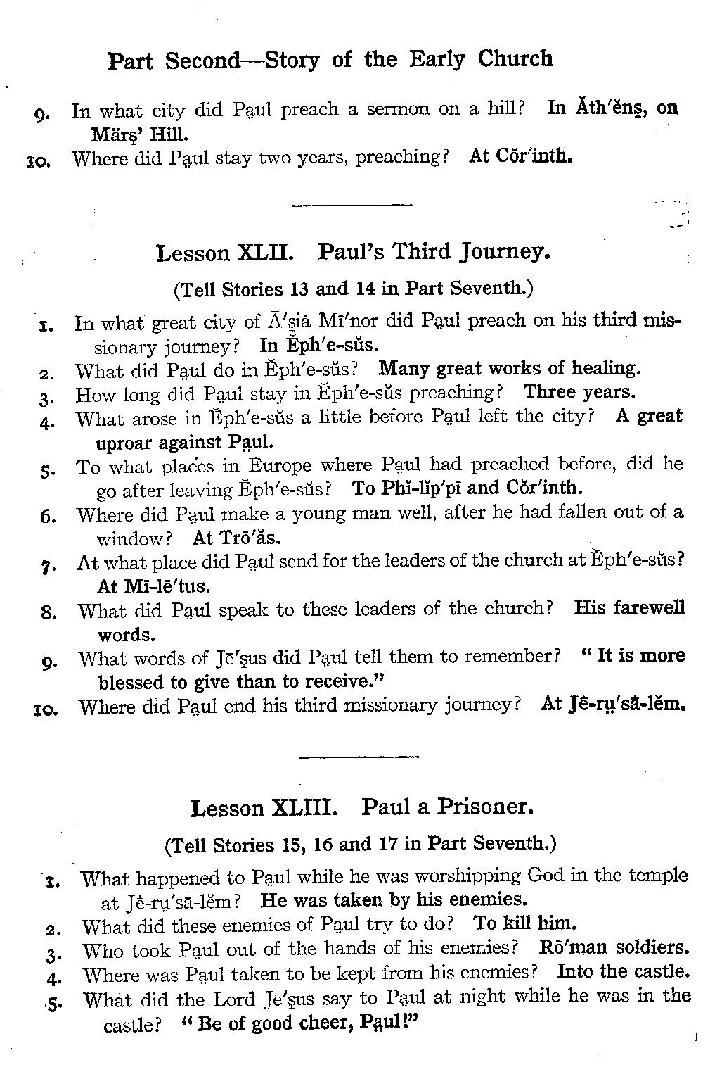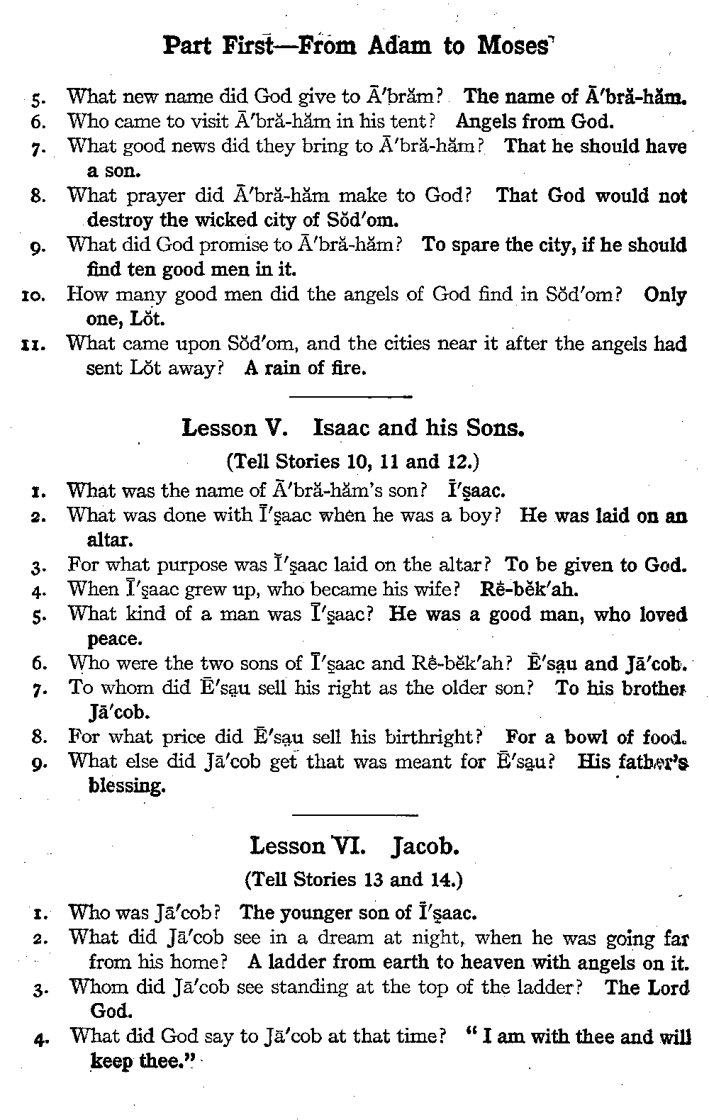 It will be seen that the questions and answers do not embrace all the stories in the book. A selection has been made of what seem to be the most important subjects, affording weekly lessons for one year, with allowance for vacations, in the Old Testament, and another year in the New Testament.