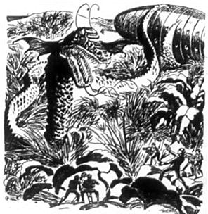 I reached the path and glanced hastily to the right, the direction, from which the great serpent was sweeping down on us. He was less than the Ertak's length away.
