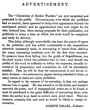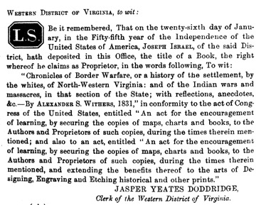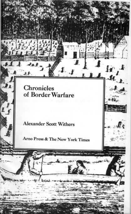In 1831, an interesting volume appeared from the press of Joseph Israel, of Clarksburg, in North Western Virginia, prepared by Alexander Scott Withers, on the border wars of the West. It was well received at the time of its publication, when works on that subject were few, and read with avidity by the surviving remnant of the participators in the times and events so graphically described, and by their worthy descendants.