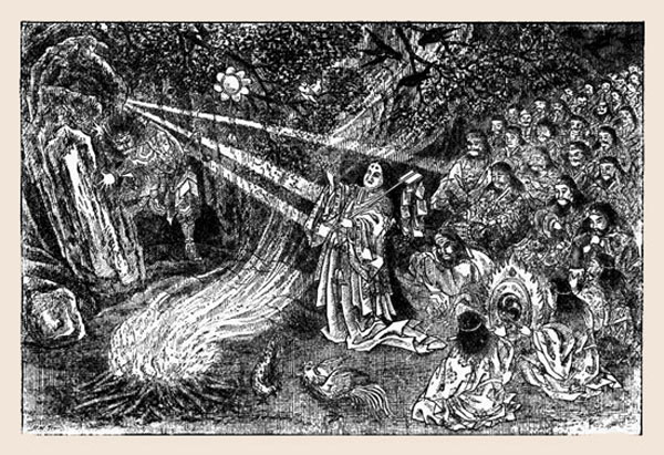 One night she sat up until two o'clock in the morning, and then, arrayed only in a white robe, she went out to a secluded part of the mountain where in a lonely shrine stood a hideous scowling image of Fudo, who holds the sword of vengeance and sits clothed in fire. There she called upon the god to change her lover's heart or else destroy him.