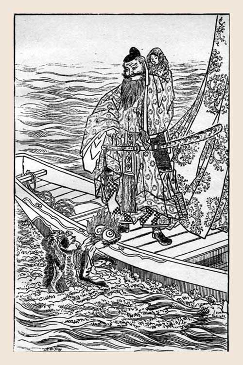 So Takénouchi took the infant Ojin on his shoulders, mounted the imperial war-barge, whose sails were of gold-embroidered silk, and bade his rowers put out to sea. Then standing upright on the deck, he called on Kai Riu O to come up out of the deep and give back the Tide Jewels to Ojin.