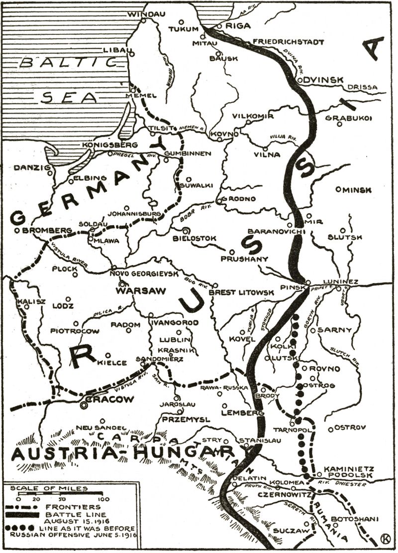 But about June 1, 1916, Russia suddenly stepped out and assailed the whole Austro-German line with fire and steel. The weight of the blow fell between the Pripet Marshes and the Rumanian frontier. From this front Germany had drawn many troops to aid in her Verdun operation, Austria had made similar drafts to swell her forces attacking Italy. Too late Berlin and Vienna realized that they had weakened their line beyond the danger point and had hopelessly underestimated the recuperative power of the Slav.