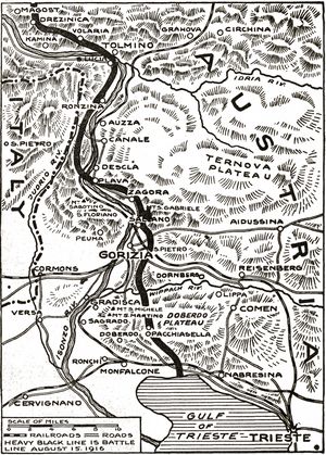 Lined section shows ground gained by the Austrians in May and June, 1916.On a front of thirty miles from the Alps to the Adriatic, their flanks secured by the mountains and the sea, the Austrians had erected a formidable system of trenches which closed the Italian road to Austria and to Trieste, twenty miles to the south. (Vol. V, 288-290.) Monte Sabotino on the north, Podgora Hill in the (p. 501) center, Monte San Michele on the south at the edge of the Carso Plateau were the main features of this position, and Gorizia lay in the cuplike valley of the Wippach behind Podgora.