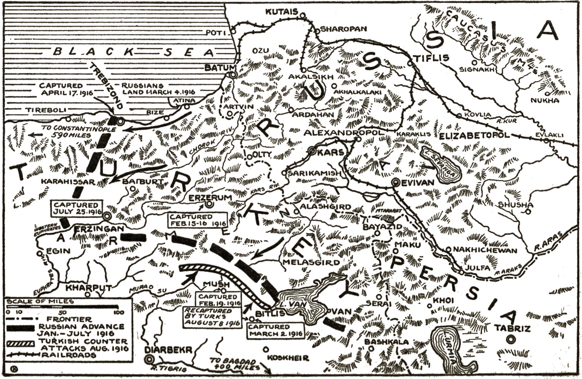 Very briefly, now, in the remaining space allowed me, I purpose to discuss the remarkable change in the whole face of the war that had come by the second anniversary of the outbreak of the conflict. The first authentic sign of this change was the great Russian success in Volhynia and Galicia about June 1, 1916. (Vol. V, 154.) As far back as February Russian successes in Asia Minor had suggested that the Russian army was regaining (p. 498) power and receiving adequate munitions. The captures of Erzerum and Trebizond were a warning that deserved, but did not earn, attention in Berlin and the British failure and surrender at Kut-el-Amara served to obscure the Eastern situation. (Vol. V, 318-326.)
