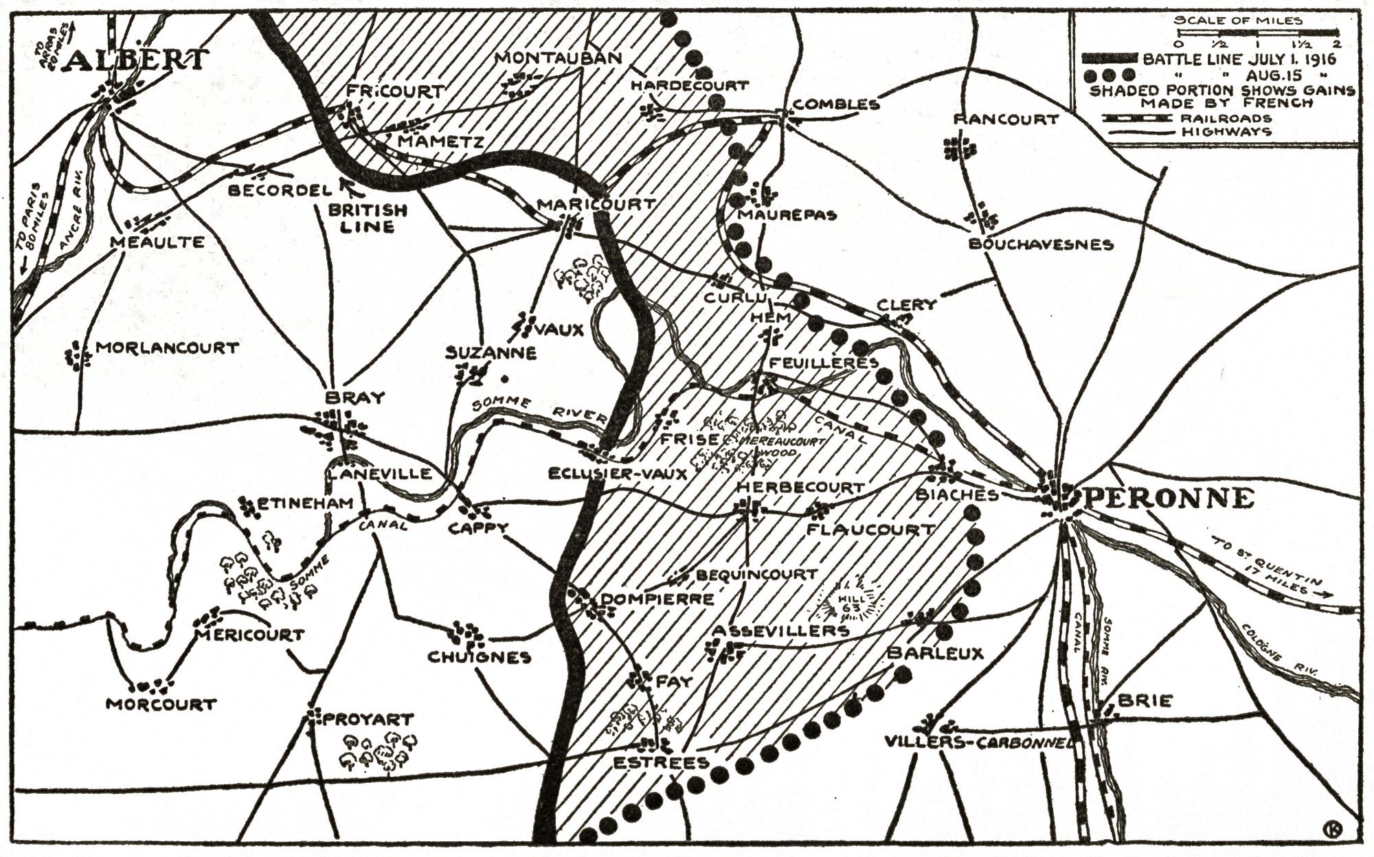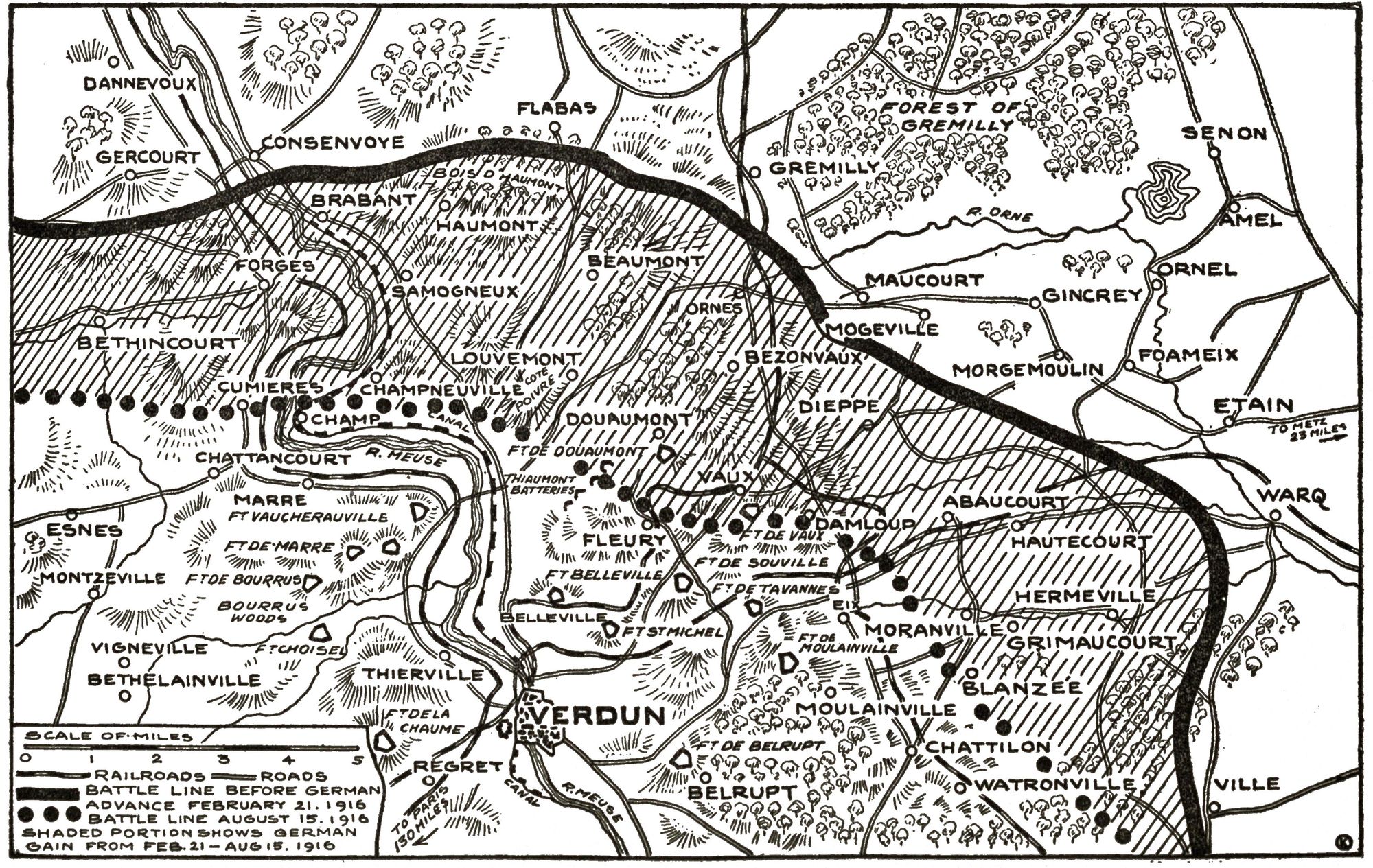 By July 1, 1915, the French were in their last ditch before Verdun—that is, on the east bank—but on July 1, 1916, there (p. 493) began that allied offensive at the Somme which changed the whole face of the western operations. Thus, by August 1, 1916, the Germans had been compelled to remove many troops from Verdun and the French were able to take the offensive here again, and by August 6, 1916, had made material progress in retaking portions of the ground they had "sold" the Germans for so great a price in previous weeks.