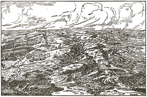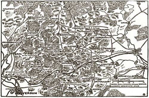 This phase lasted from April 9, 1916, down to the opening of July. During that time the Germans pushed out from Douaumont and captured Vaux; they crowded up and over Dead Man's Hill and up the slope of Hill 304; by July 1, 1916, they had pushed the French right back to the extreme edge of the hills, on the east bank of the Meuse, and the French were just holding the inside line of forts—Belleville, Souville, and Tavannes—with their backs to the river and with German trenches coming right up to the ditches of these three forts.