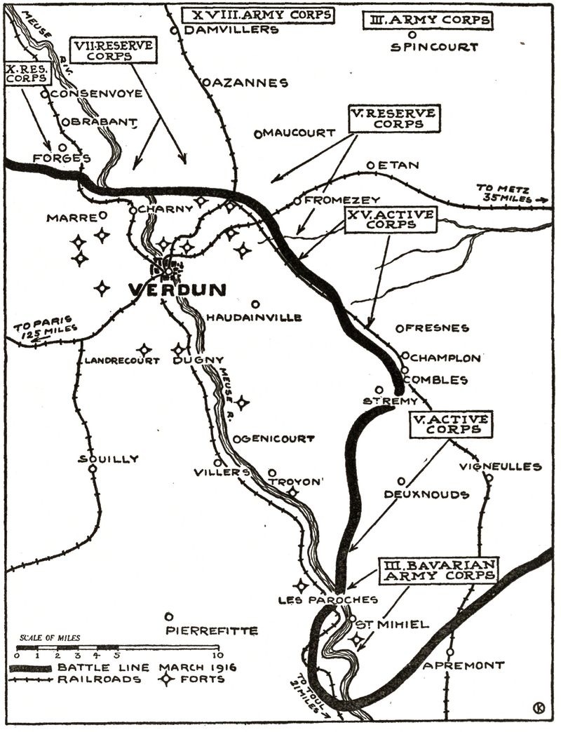 Accordingly Germany decided to attack in the west. She selected Verdun as the objective for reasons not at first clear but now well known. Verdun was in the public mind a great fortress, surrounded by impregnable works, the strongest point on the French front. In fact it was the weakest sector. The forts had been evacuated, the first line defenses some miles north of the town were strong, but the second and third had been neglected. The line was held by less than two army corps of territorials; there were other faults in preparation chargeable to the politicians. Worst of all of these was the lack of rail communications due to failure to build new lines to replace those cut by the Germans, who at St. Mihiel blocked the north and south line from the Paris-Nancy trunk line and at Montfaucon and Varennes interrupted the Paris-Verdun railroad by indirect fire.