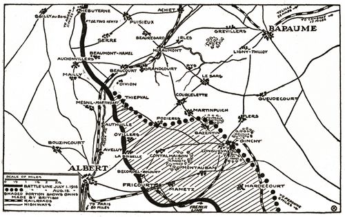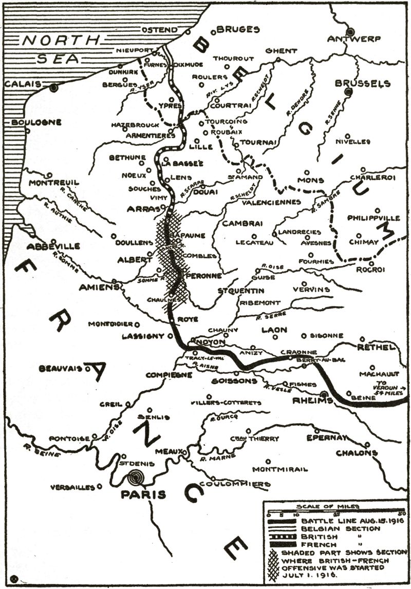 But on July 1, 1916, just as the Russian drive was slowing down and while Germany was straining every nerve to meet the eastern crisis, the French and British along the Somme suddenly broke out in a terrific attack over twenty miles of front. The French rapidly approached Péronne, the British more slowly by steadily moving toward Bapaume. Here was the answer to the German assertion that Verdun had exhausted France and made an allied offensive in the west impossible. It was as complete a refutation of reckonings for the west as the Russian victory had been of the German calculations for the east.