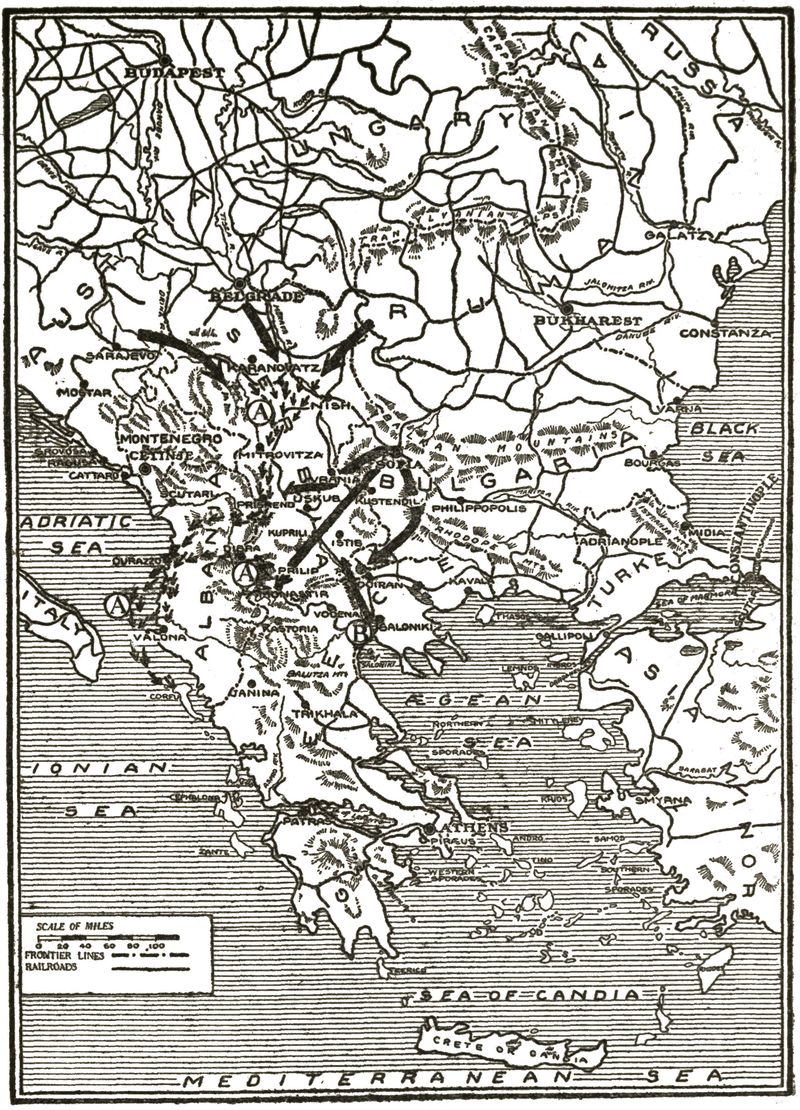 Finally, in the Balkans a great Anglo-French-Serb army is standing before Saloniki (Vol. V, 212-215), only waiting until Germany shall have recalled her troops from the Peninsula and Austria summoned back her contingents to strike the Bulgarians and strive to reopen the road from the Ægean to Belgrade, thus cutting the railroad that binds Berlin to Byzantium and the Osmanli to the Teuton. Similarly the victorious Russians have passed Erzingan in Asia Minor (Vol. V, 337), completed the conquest of Armenia, and are pushing on toward Sivas and the Bagdad railroad. (Vol. V, 335-339.)