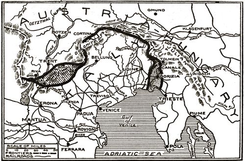 For the attack the Austrians selected the Trentino district. If they could drive their masses through the Italian lines between the Adige and the Brenta, and enter the Venetian Plain, taking Verona and Vicenza, all the Italian forces to the eastward along the Isonzo would have to retreat and might be captured. At the least, Austria might hope to carry her front to the Po and the Adige, and thus stand on the defensive far within Italian frontiers, as Germany stood within French frontiers.