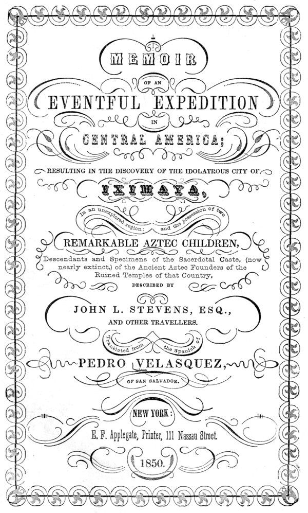 At this place, while loitering to procure information and guides for their future journey to Santa Cruz del Quiche, they got acquainted with Sr. Pedro Velasquez, of San Salvador, who describes himself as a man of family and education, although a trader in indigo; and his intermediate destination, prior to his return to the capital, happening also to be the same city, he kindly proffered to the two Americans his superior knowledge of the country, or any other useful service he could render them; and he was accordingly very gladly received as their friend and companion on the way. It is from a copy of a manuscript journal of this gentleman, that the translator has obtained the only information as yet brought to the United States concerning the remarkable results of the exploring expedition which he will proceed to describe, or of the fate of Messrs. Huertis and Hammond, its unfortunate originators and conductors, or of those extraordinary living specimens of a sui generis race of beings, hitherto supposed to be either fabulous or extinct, which are at once its melancholy trophies and its physiological attesters. And it is from Senor Velasquez alone that the public can receive any further intelligence upon this ardently interesting subject, beyond that which his manuscript imperfectly affords.