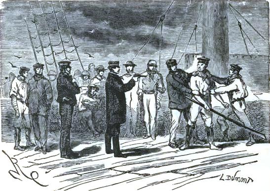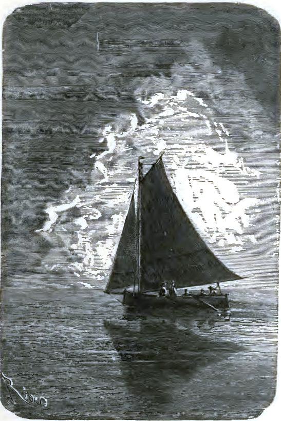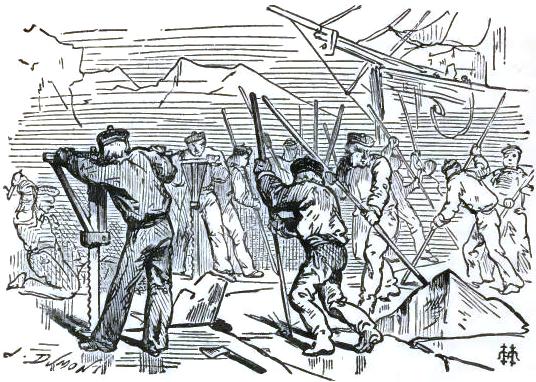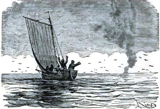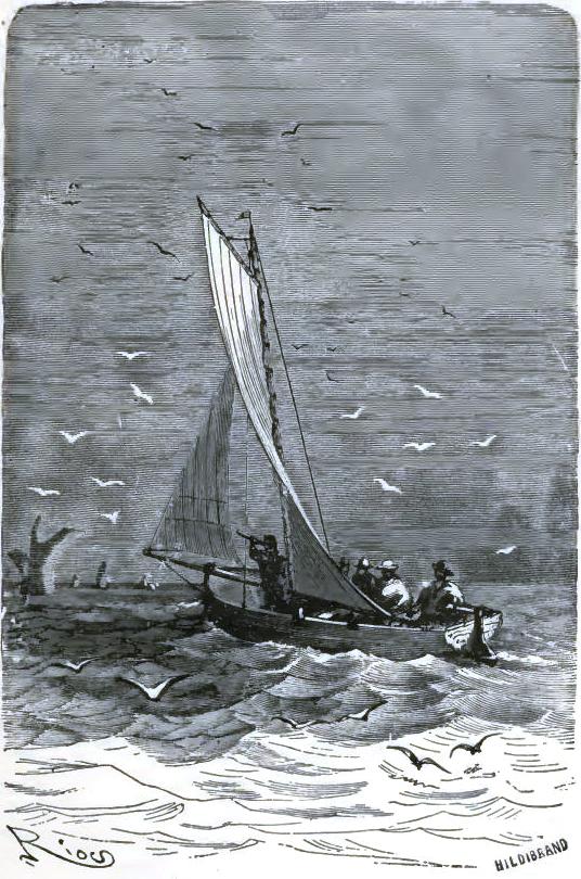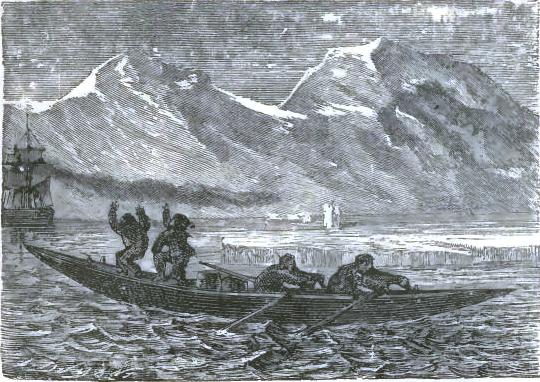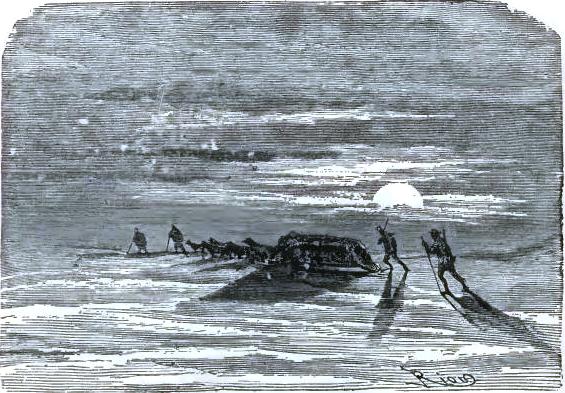 Bell, with Altamont's aid, ran to the sledge; he brought one of the uprights, stood it up on the floe for a mast, making it fast with ropes; the tent was torn up for a sail. The wind was fair; the poor castaways put out to sea on this frail raft.