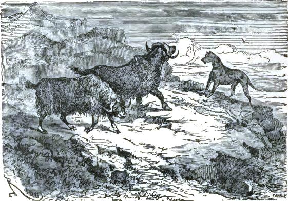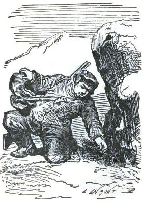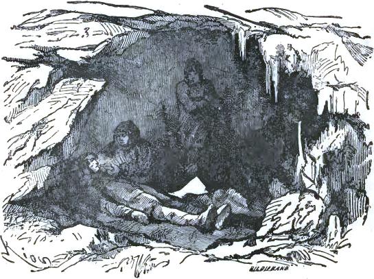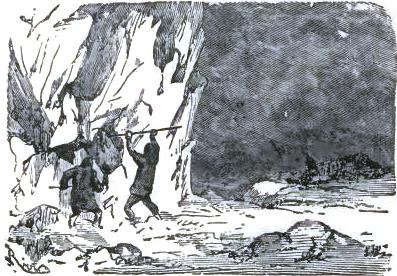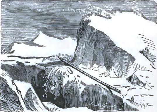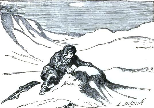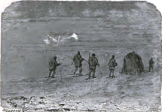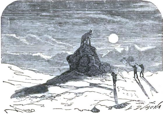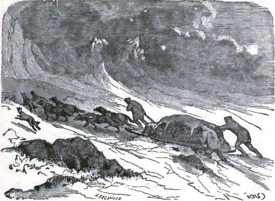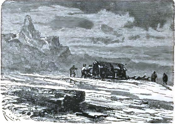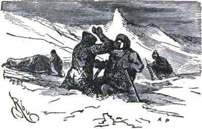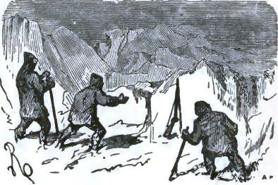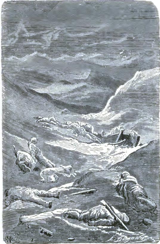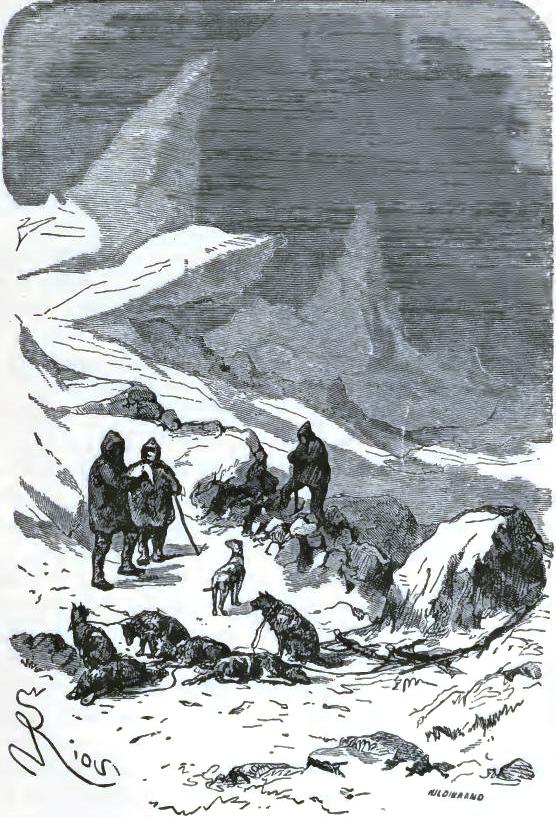 It was not until August 30th that they at last left the chaos of mountains, of which one can form no idea from the mountains of lower zones, but they left it half dead. The doctor could no longer cheer up his companions, and he felt himself breaking down. The Trauter Mountains ended in a sort of rugged plain, heaped up at the time of the formation of the mountains. There they were compelled to take a few days of rest; the men could not set one foot before another; two of the dogs had died of exhaustion. They sheltered themselves behind a piece of ice, at a temperature of -2°; no one dared put up the tent. Their food had become very scanty, and, in spite of their extreme economy with their rations, they had a supply for but a week more; game became rarer, having left for a milder climate. Starvation threatened these exhausted men.