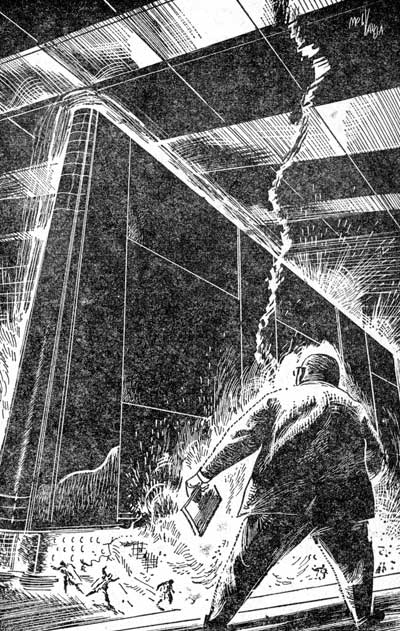 Beardsley hurried toward the roof entrance. His faded blue suit, a size too large, flapped about him, and the outmoded felt hat seemed to sink to the level of his thick-lensed glasses. The guard greeted him, but suppressed a smile as the cherubic little man flashed his official pass.