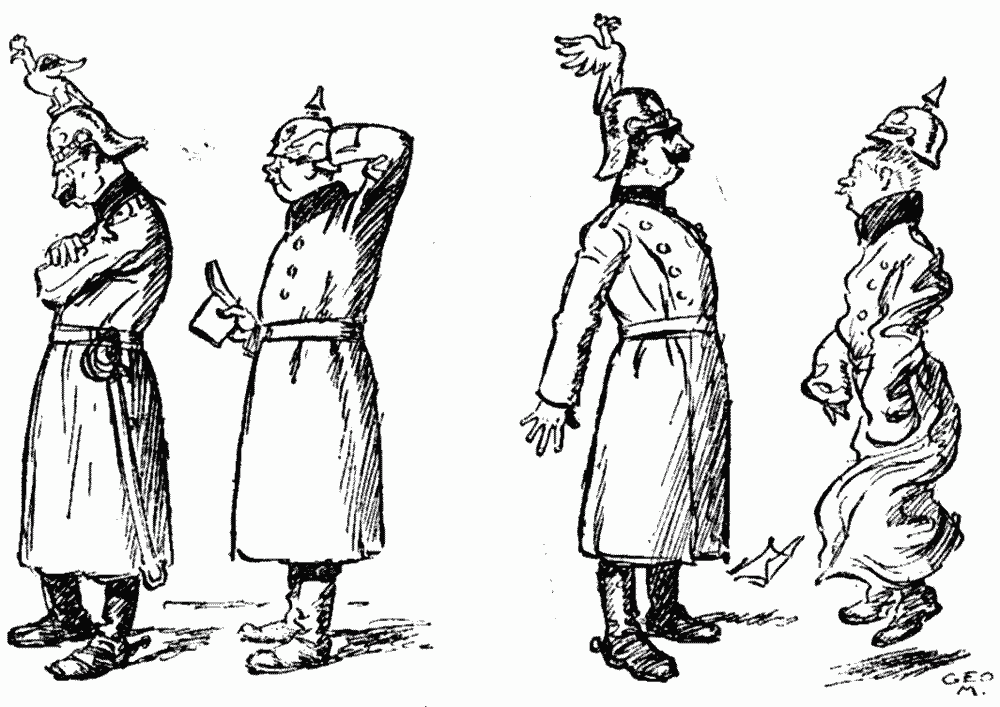 May I now add a few words about the War? Somehow it does not seem that we are getting on as we have been led to expect. Mind, I am not blaming anybody, certainly not your most gracious fatherly Majesty, but I must say that all the books which we were told to read showed us quite a different war, a war laid out on the system of 1870. At this stage, in 1870, everything was over except the siege of Paris and the shouting, but now we do not appear to be making progress anywhere. Why do these degenerate races hold back our holy and with-love-of-Fatherland-inspired troops? Perhaps the new Moltke has not been quite so sure in his touch or so triumphant in his plans as the old one—but then that ought not to have made much difference, because you and I have been there to keep him straight. Falkenhayn, no doubt, might have been expected to do better, for you had opened your whole mind to him, but he too seems only able to knock his head against a stone wall (seinen Kopf gegen eine Mauer stossen) and the result is that we are everywhere getting it in the neck (dass wir es überall in dem Hals kriegen), and that process is not pleasant for a true Hohenzollern. It is possible that Rupert of Bavaria has been allowed to talk too much. One Crown Prince is enough even for a German army. Have you any idea what we ought to do to secure victory somewhere?