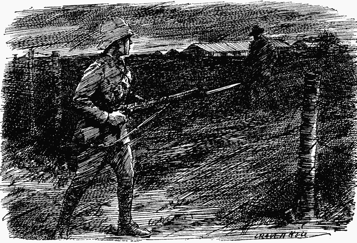 I was sitting grimly in my sentry-box guarding a power station and a sausage factory. The latter is considered to be a likely point of attack on the part of the Huns. Should it be destroyed, a vital source of food supply for our army (they would reason) would be cut off.