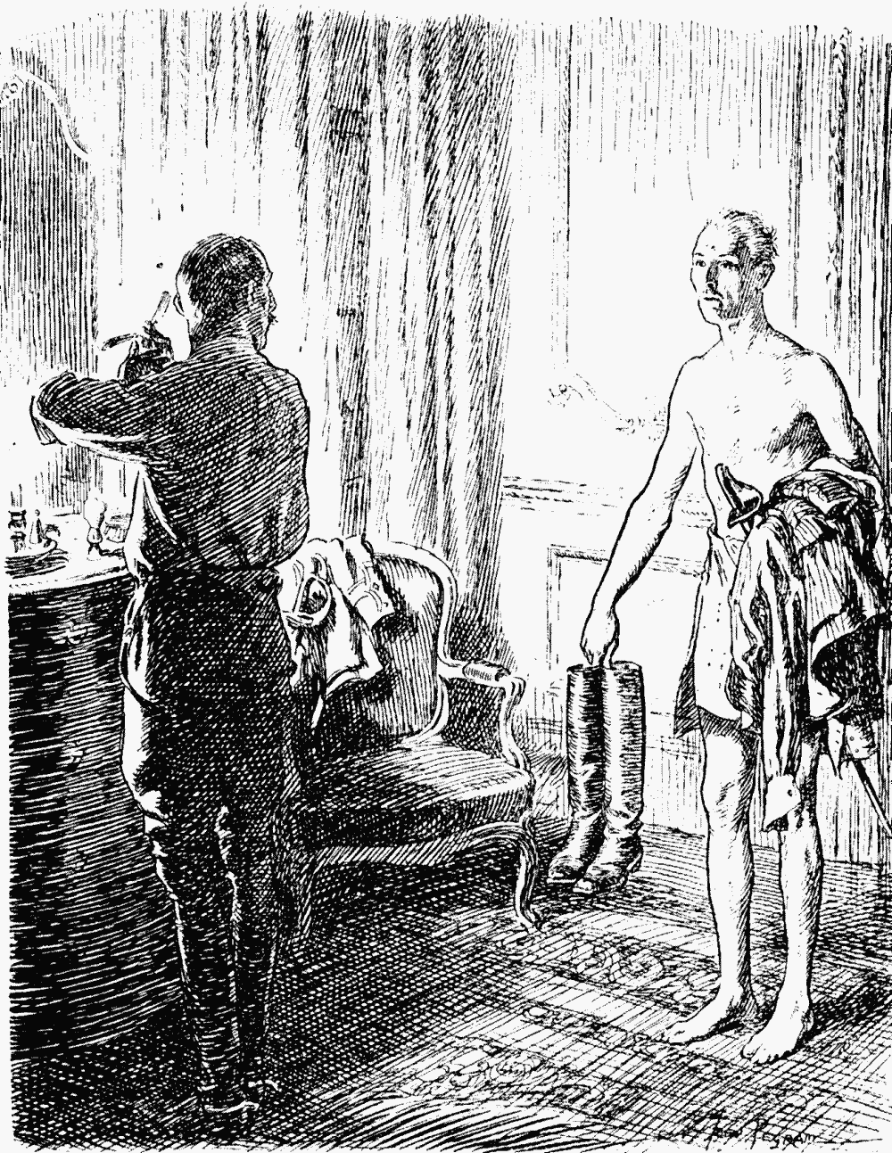 "Perhaps," I interrupted, "your friend would like to change places with me. Then you can scrutinise him at your ease—and mine."