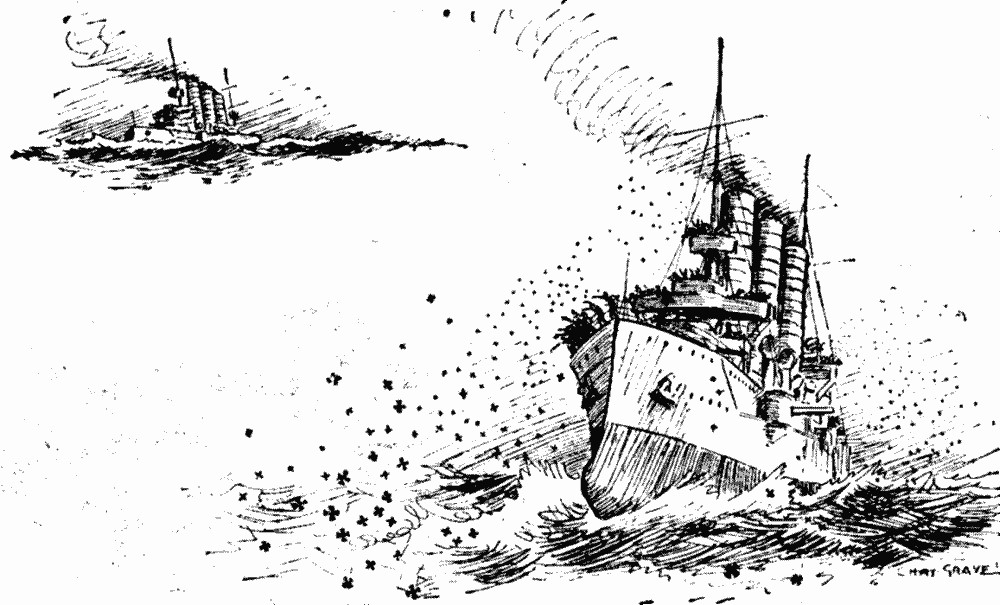Captain of a German cruiser, hurrying home after shelling health-resort, gives orders to lighten the ship for the sake of speed.