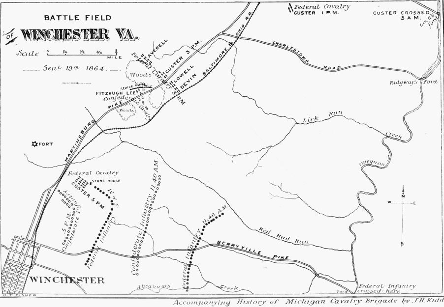 [25] On page 813, Vol. XXXVI, Series I, Part 1, of the War Records, in the report of General Merritt appears the following: "A charge made, mounted, by one regiment of the First brigade, (the Fifth Michigan)." The words in parenthesis should be the First Michigan. It is a pity that the official records should thus falsify history.
