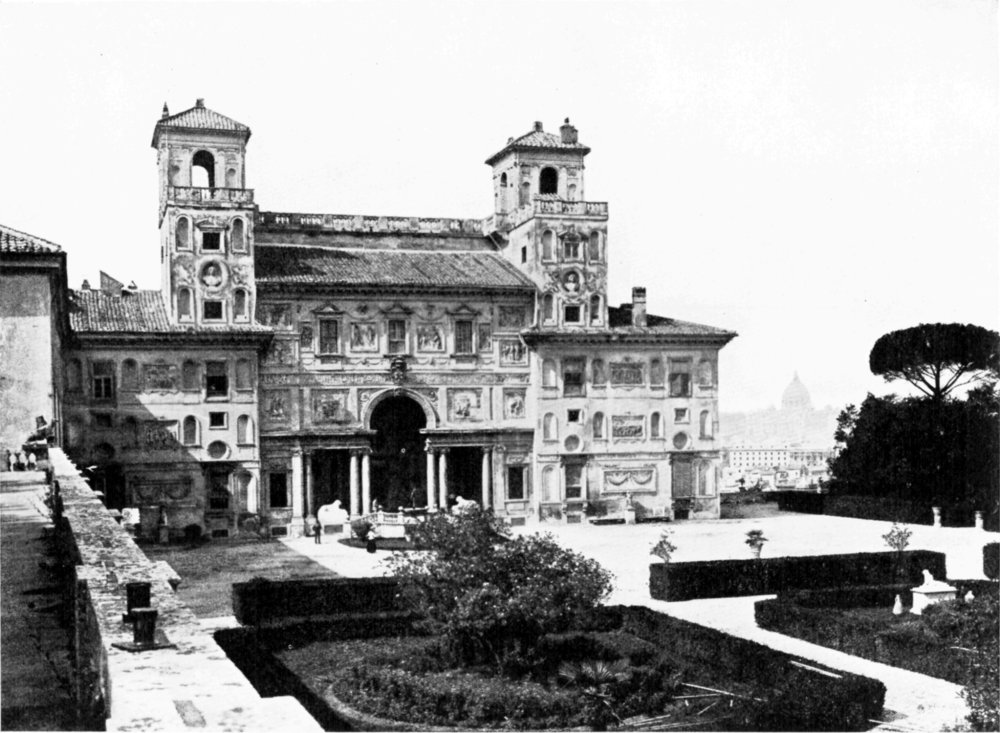 Rome, as the picturesque city of the Popes in the middle years of the nineteenth century, was resplendent in local color. It was the Rome of sunny winters; the Rome of gay excursions over that haunted sea of the Campagna to pictorial points in the Alban and Sabine hills; the Rome of young artist life, which organized impromptu festas with Arcadian freedom, and utilized the shadow or the shelter of ruined temples or tombs in which to spread its picnic lunches and bring the glow of simple, friendly intercourse into the romantic lights of the poetic, historic, or tragic past. There were splendid Catholic processions and ceremonials that seemed organized as a part of the stage scenery that ensconced itself, also, with the[4] nonchalance of easy possession, in the vast salons of historic palaces where tapestried walls and richly painted ceilings, arched high overhead, with statues dimly seen in niches here and there, and the bust of some crowned Antoninus, or radiant Juno, gleaming from a shadowy corner, all made up the mise-en-scène of familiar evenings. There were lingering hours in the gardens of the Villa Medici into whose shades one strolled by that beguiling path along the parapet on Monte Pincio, through the beautiful grove with its walks and fountains. The old ilex bosquet, with its tangled growth and air of complete seclusion, had its spell of fascination. Then, as now, the elevated temple, at the end of the main path, seemed the haunt of gods and muses. In all the incidental, as well as the ceremonial social meeting and mingling, art and religion were the general themes of discussion. This idyllic life—