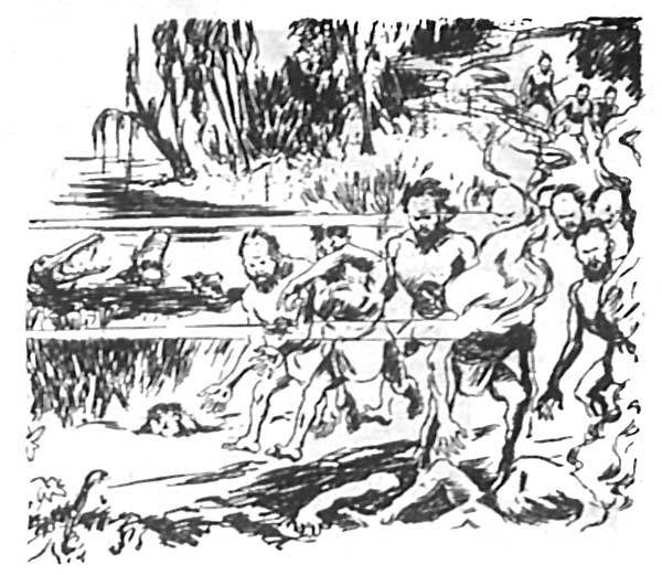 The current was strong, but the water gradually became shallower as they ascended the sloping rock. After half an hour they saw ahead of them the loom of the forest, and with some trepidation they entered the gloom cast by the towering, fernlike trees, whose tops disappeared in murky fog. Tangled vines impeded their progress. Quagmires lay in wait for them, and tough weeds tripped them, sometimes throwing one or another into the mud among squirming small reptiles that lashed at them with spiked, poisonous feet and then fell to pieces, each piece to lie in the bubbling ooze until it grew again into a whole animal.